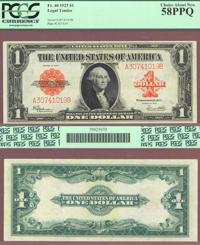 Item Number: LLTN-65 PCGS Choice About New 58 PPQ - FR-40 Speelman/White - Bright red overprint on creamy Premium Paper with great margins. The 1923 Legal Tender red seal notes are much harder to find that the 1923 blue seal Silver Certificates. $695.00