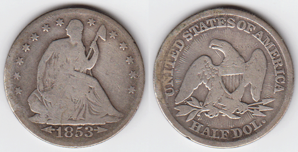 1853 50c Arrows & Rays US Seated Liberty silver half dollar