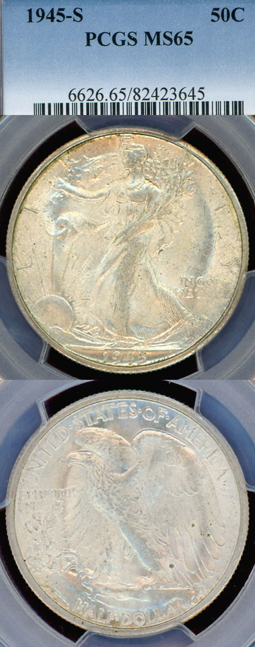 1945-S 50c US walking liberty silver half dollar PCGS MS 65