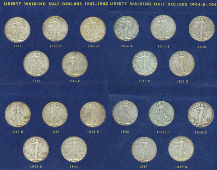 Item Number: WLHD-435 Very Fine or Better - Walking Liberty Silver Half Dollar set 1941 -1947 with all mints P, D and S. The set includes 20 coins in a 2 page Blue Whitman Album. Nice looking original unmolested set.$500.00