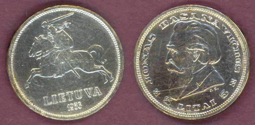Item Number: LITH-23 Extremely Fine - 5 Litai #82 .750 Silver - National coat of arms Knight riding a stallion. Dr. Jonas Basanavicius facing left. Made only one year.$50.00