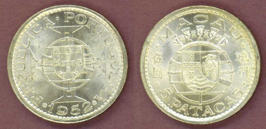 Item Number: Macao-23 Uncirculated - 5 Patacas KM-5 .720 Silver. Brilliant white Choice uncirculated coin. The size of a half dollar.$45.00