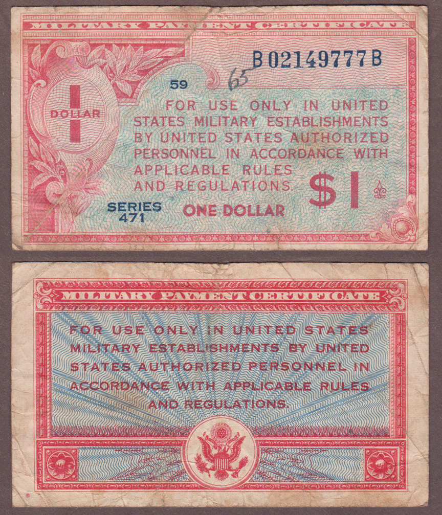 Fine - Issued 3/10/47 to 3/22/48 - 65 in pen under upper serial #. Aqua&Red face with blue printing, Blue/Red back.