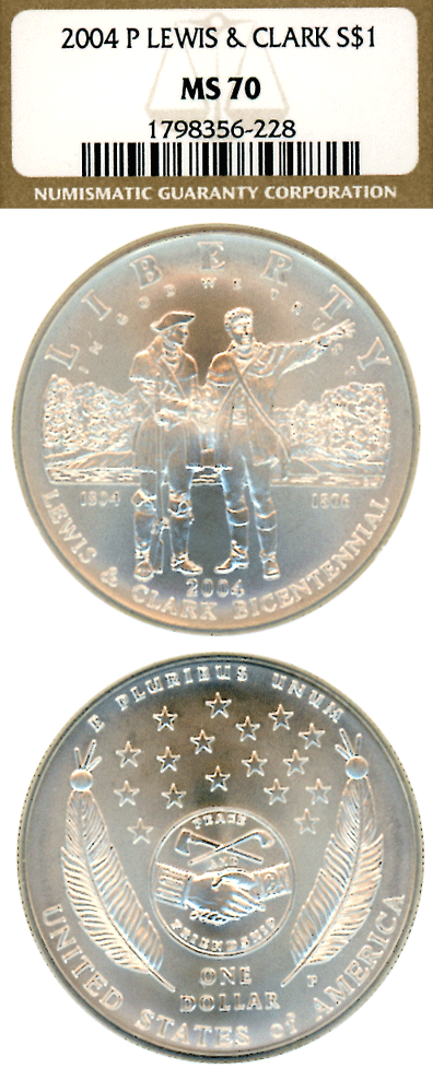 NGC Mint State 70 - Lewis & Clark Bicentennial - .900 Fine Silver - Beautiful commemorative dollar.