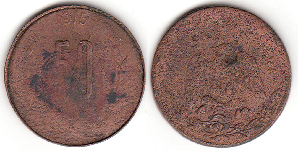 Item Number: MXREV-96 Very Good+ KM#703 Copper 28-29 MM - Value within lined C and 1/2 wreath date at top. Rev: National arms. Cleaned at one time. Rough porous planchet.$25.00