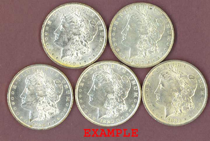 Item Number: MD-737E You will receive 5 different (1879-1904) Morgan Silver Dollars that will grade Mint State-60 or better. Attractive BU dollars that will have nice mint luster.$360.00