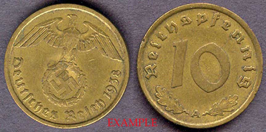 Item Number: Ger-44E Fine or Better - #92 - 10 Reichspenning Aluminum-Bronze Eagle on Swastika Berlin Mint.$5.00