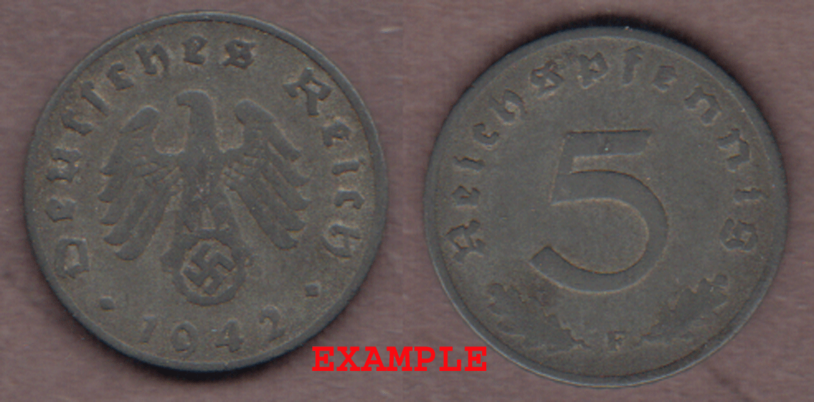 Item Number: GER-153E Very Good or Better - #100 - 5 Reichspfenning Zinc - Various Mints with Eagle on Swastika. About the size of a US dime.$10.00