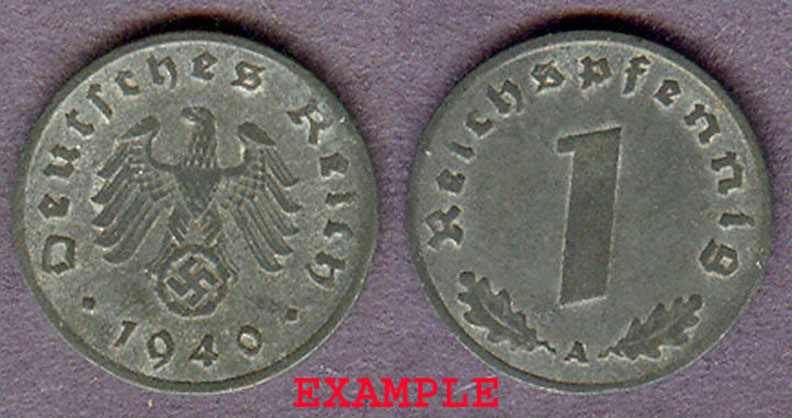 Item Number: Ger-52E Fine or Better - #97 - 1 Reichspenning Zinc Various Mints with Eagle on Swastika. About the size of a US dime.$10.00