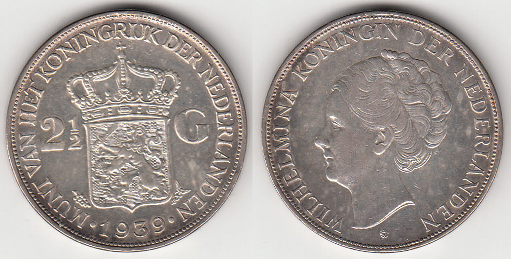 Item Number: NE-39 Extremely Fine - KM#165 2-1/2 Gulden .720 Silver. Large silver dollar size with head of Queen Wilhelmina.$85.00