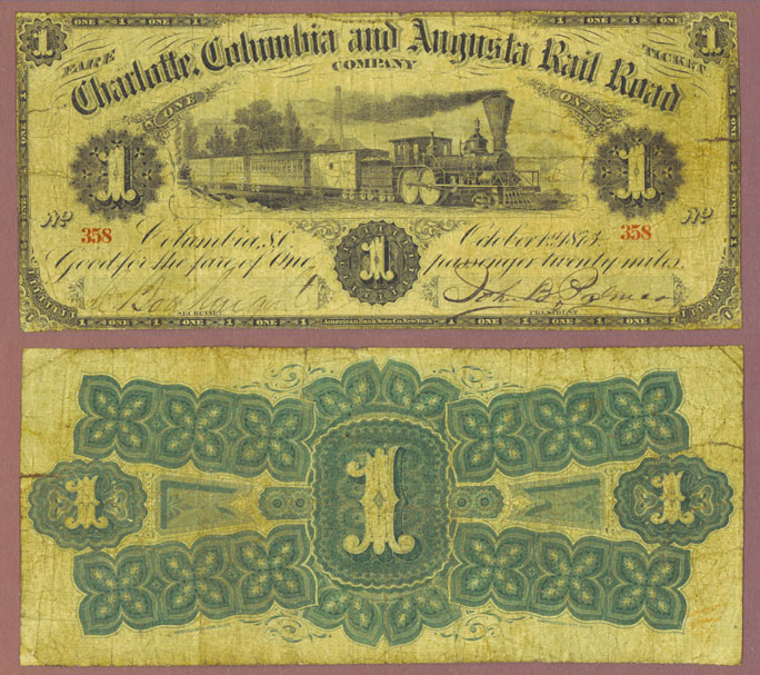 Fine - Charlotte, Columbia and Augusta Rail Road Company - October 1st. 1873 Good for the fare of one passenger 20 miles. Great image of Train at center with ornate green back. A couple of short edge splits. Printed by American Bank Note Co. New York.