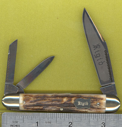 Rig-24 This is a 3-5/8" triple bladed knife from the internationally known knife makers from Solingen, Germany. This knife is handmade with Genuine Stag (White) and the finest hammer forged Solingen Steel with the RIGID inlaid shield. It also has RIGID frosted etched on the clip blade. This is a new knife from an old collection. You would have a hard time finding one like this in today’s market! A well made quality knife that is seldom seen.