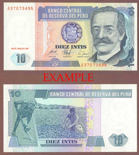 Choice Uncirculated - 10 Intis #129 Front is Black, dark blue and purple on multi-colored underprint with portrait of Ricardo Palma at right. Indian farmers digging and picking cotton.