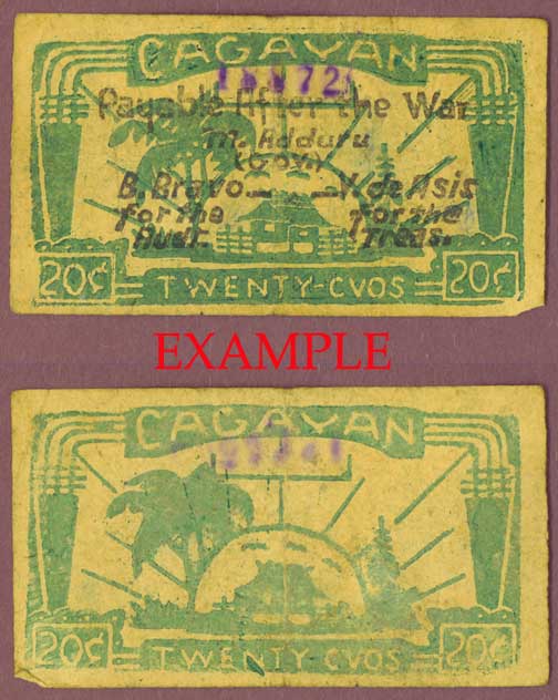 Item Number: PHIL GU-29E Fine or Better - #S183 ND Cagayan Province Small size note approximately 3" X 1-3/4" - Green ink with manilla paper and black overprint. Small hut and trees.$7.00