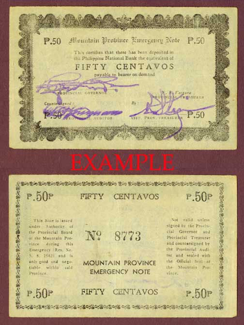 Item Number: PHIL GU-24E About Uncirculated or Better - #S594 Mountain Province Small size note approximately 4-1/2" X 2-3/4"- Black ink on thin white paper with serial number on back.$10.00