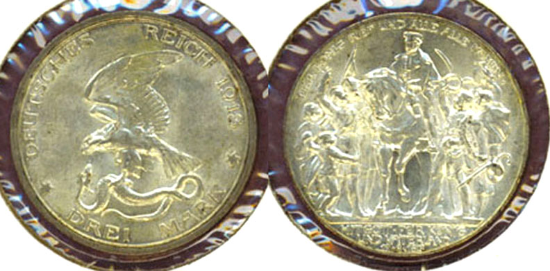 Item Number: Ger-29 About Uncirculated - 3 Mark .900 Silver #534 Berlin Mint 100 Year Anniversary - Defeat of Napoleon. Eagle and Snake on the obverse. A one year type coin.$95.00