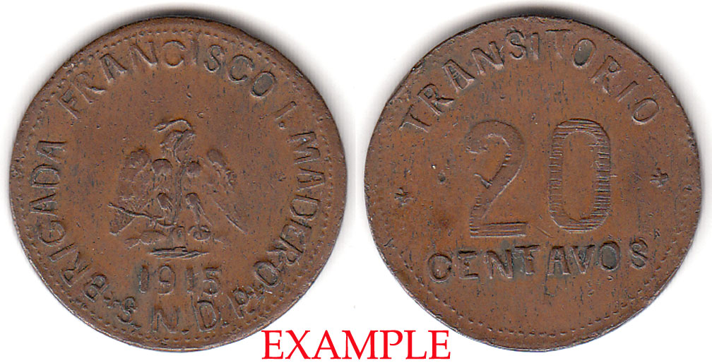 Item Number: MXREV-83E Very Fine or Better - KM#757 Copper 28 MM - Date below national arms with legend: Madero Brigade. Rev: Value at center with rosettes.$25.00
