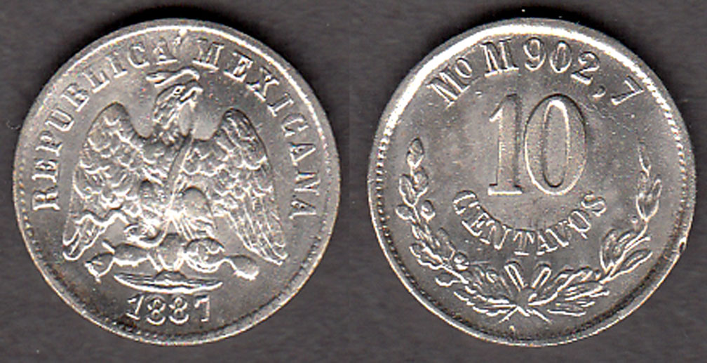 About Uncirculated - #403.7 .9020 Silver - Nice mint luster remains on this 10 centavo from the Mexico City Mint.
