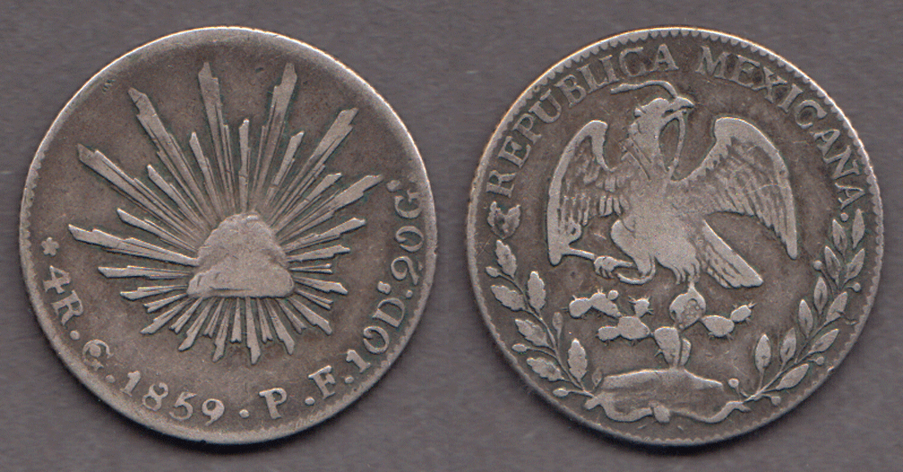Fine+ #375.9 375.4 .9030 Silver Approximately 32 MM - Republic Cap And Rays Tougher 4 Reales from the Guanajuato Mint