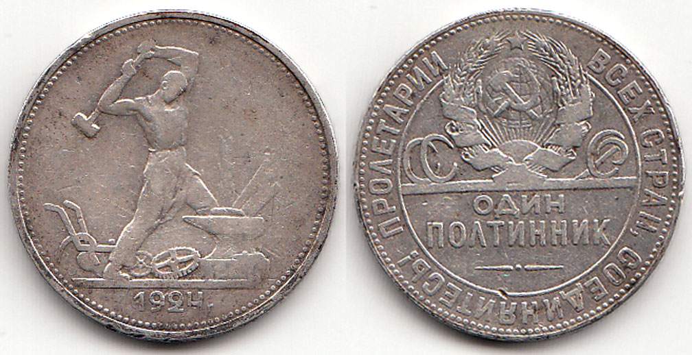 Item Number: RUS-42 Fine+ 50 Kopeks #89.1 .900 Fine silver - National arms divide CCCP above inscription, circle surrounds all. Blacksmith working at anvil. Almost the size of a US half dollar.$60.00