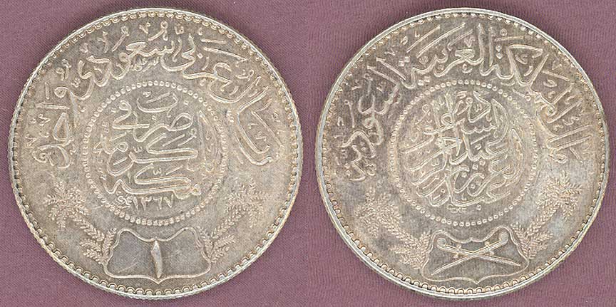 Item Number: SAUD-25 About Uncirculated - 1 Riyal .9170 Fine Silver KM#18 Three Year Type Coin made in 1947.$45.00