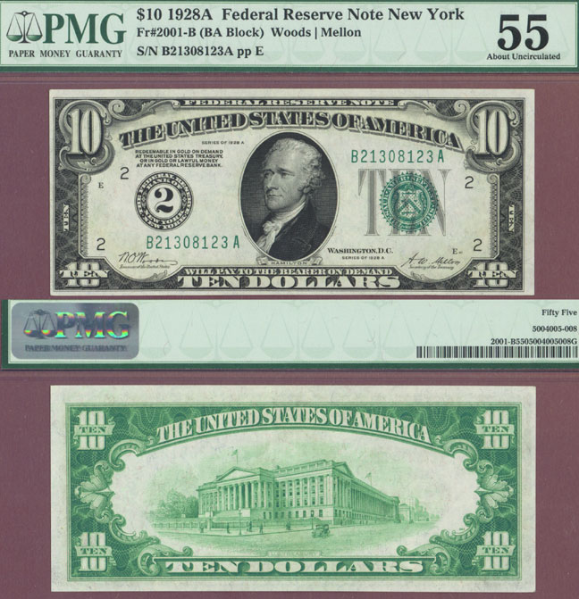 1928-A - $10.00 FR-2001-B Numeral Note US small size federal reserve note PMG AU 55