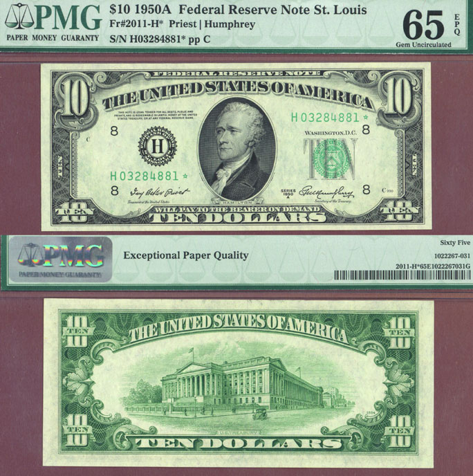 Item Number: SFRN-265 PMG GEM Uncirculated EPQ - Beautiful bright fresh and clean GEM "STAR" note from the St. Louis District. Priest/Humphrey FR-2011-H*$295.00