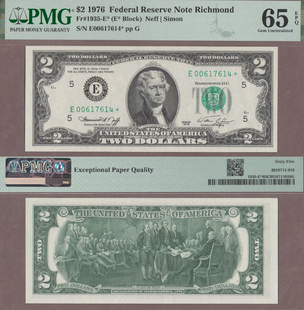 Item Number: SFRN-373 PMG Gem Uncirculated 65 EPQ - FR-1935-E* Neff/Simon - GEM Uncirculated Bicentennial "STAR" note from the Richmond Virginia Federal Reserve District "E".(Only 640,000 printed!). White clean with EPQ "Exceptional Paper Quality"$125.00
