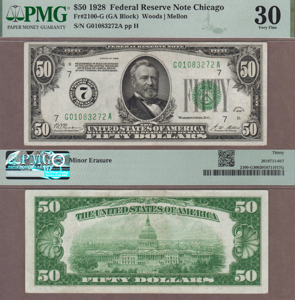 SFRN-368 PMG Very Fine 30 - FR-2100-G Tate/Mellon - Early small size Federal Reserve note with numerals in federal reserve seal. Well margined and original paper surfaces on this Chicago District note. Light pencil mark to the right of Treasury Seal. The 1928 series is the only $50 to have the numerals in the seal design.