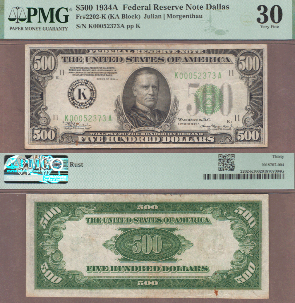 Item Number: SFRN-363a PMG Very Fine 30 Rust - FR-2202-K Julian/Morgenthau - Small rust stain. Well centered original note from the Dallas District. *NO CREDIT CARDS OR PAYPAL ON LARGE DENOMINATION NOTES. PAYMENT MUST BE MADE BY BANK WIRE 361-980-3997 FOR DETAILS.*$2,100.00