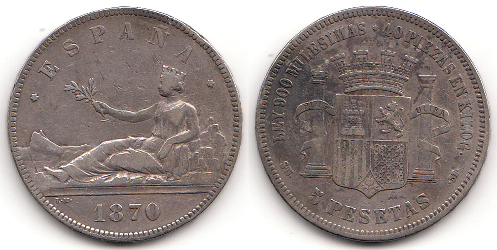 Item Number: SPA-35 Very Fine+ 5 Peseta KM#655 .900 Silver - High grade VF. This Type made for only 2 Years.$95.00