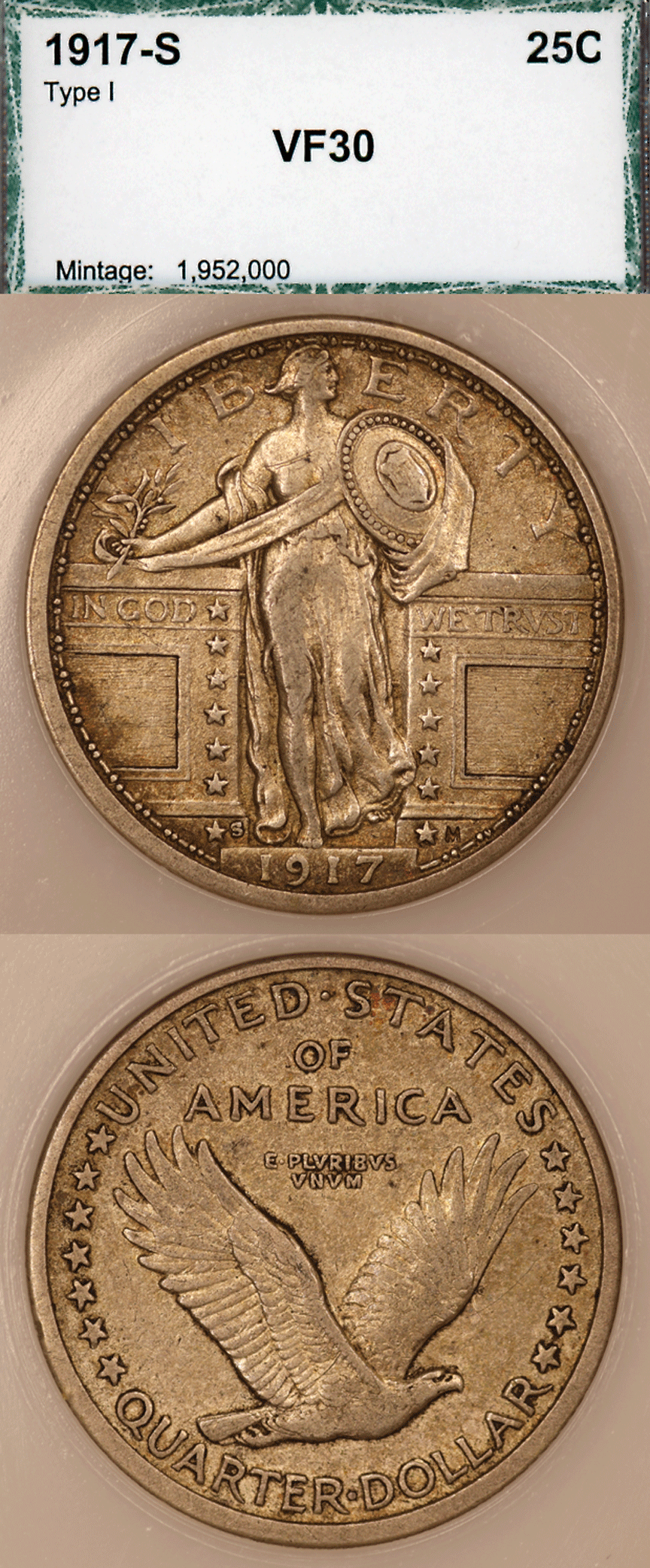 PCI Very Fine 30 - In green PCI holder. Sharp details high grade VF. Early San Francisco Mint Type-1 Standing Liberty Quarter. Mintage of only 1,952,000