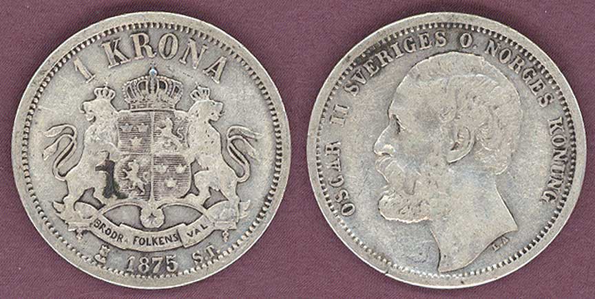 Item Number: SWE-31 Fine/Very Fine 1875 ST #741 .800 Silver - Made only 2 years 1875 & 1876. Ruler Oscar II 1872-1907.$95.00