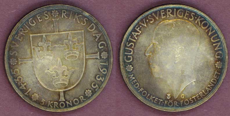 Item Number: SWE-28 About Uncirculated+ 5 Kronor KM#806 .900 Fine Silver. Original uncleaned One Year Type Coin! 500th Anniversary of Riksdag. Ruler Gustaf V$95.00
