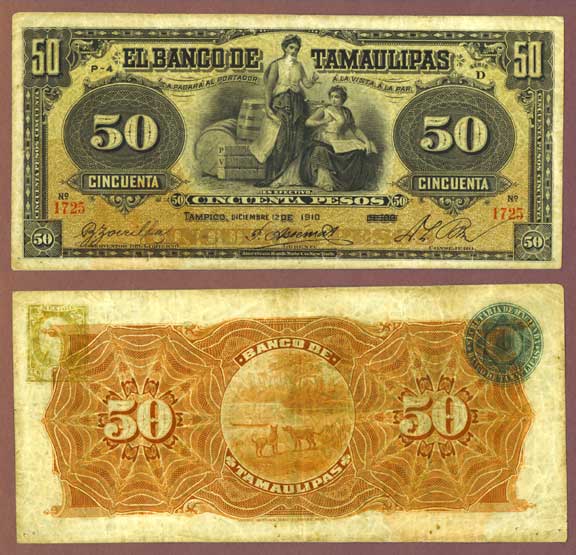 Item Number: MXP-29 Fine #S432-B 1-12-1910 Large Note. Great original note. Front is black on brown with yellow under printing. Two females at center representing Commerce. Back is dark brown with dogs at center. Made by the American Bank Note Company.$350.00