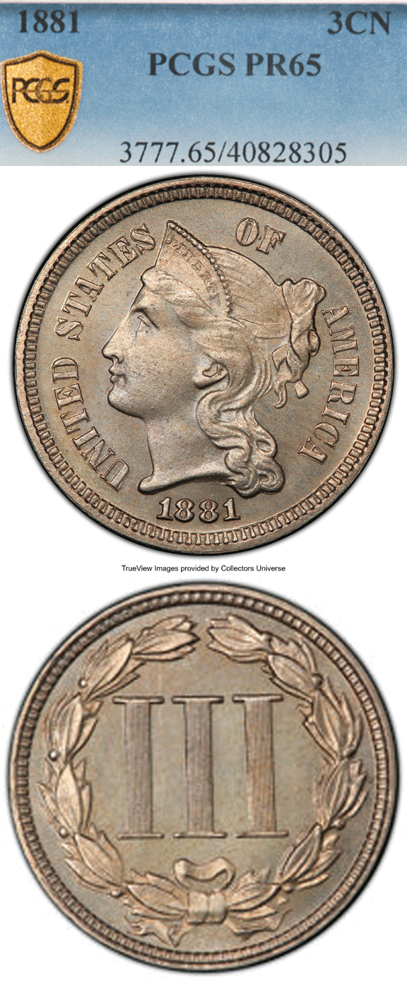 1881 3c Proof 65 US Tree cent nickel PCGS Proof 65