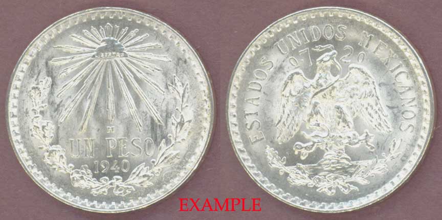 Item Number: MX-158E Uncirculated - #455 One Peso .720 Silver Cap and Rays design on obverse. Struck at the Mexico City mint.$45.00