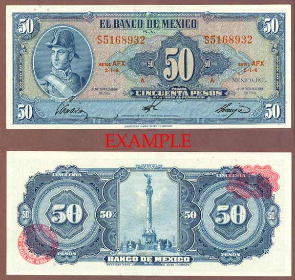 Choice Uncirculated - #49N Nov. 8 1961 Front is blue on multi-colored underprint green and reds with red serial numbers. Left side has portrait of Ignacio de Allende. Back of note is blue with Statue of victory at center with red seals.