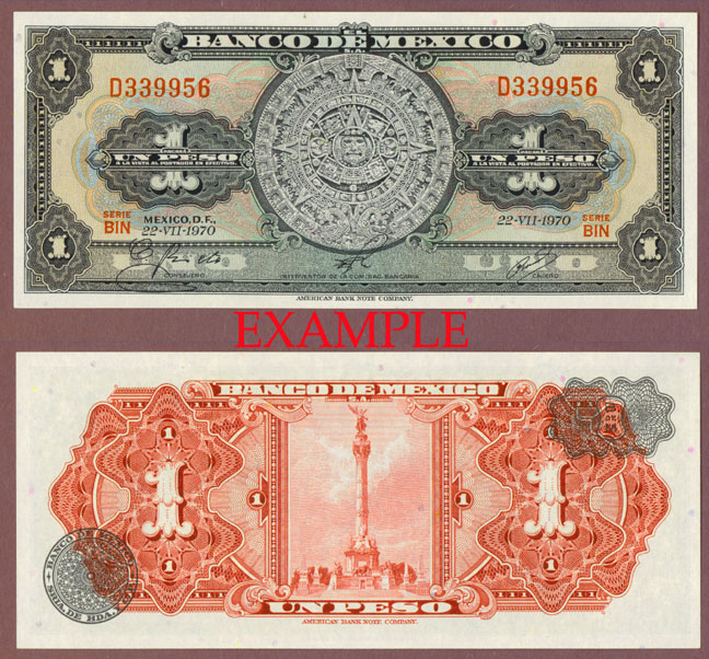 Item Number: MXP-24A Choice Crisp Uncirculated - #59 Front is black on multi-colored underprint with muted shadings of blue, mint and peach behind an Aztec calendar stone at center. Back is red with a picture of the Independence Monument at center. (Dates our choice)$2.00
