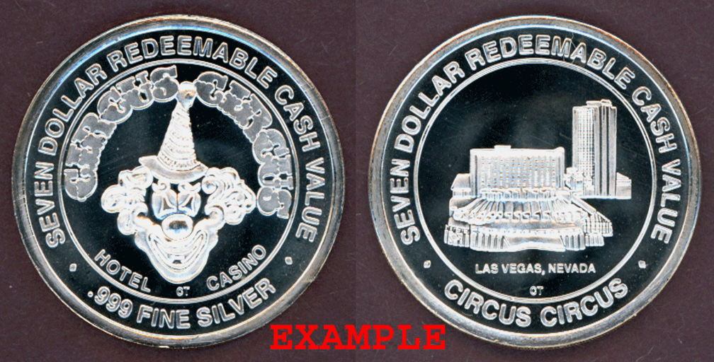 Las Vegas Casino Token from "Circus Circus" - About Uncirculated .999 Pure Silver Approximately 37MM Almost Silver Dollar Size. The Circus Circus is still in business today on the Strip. Comes in the original plastic capsule some with scratches but the tokens are nice.