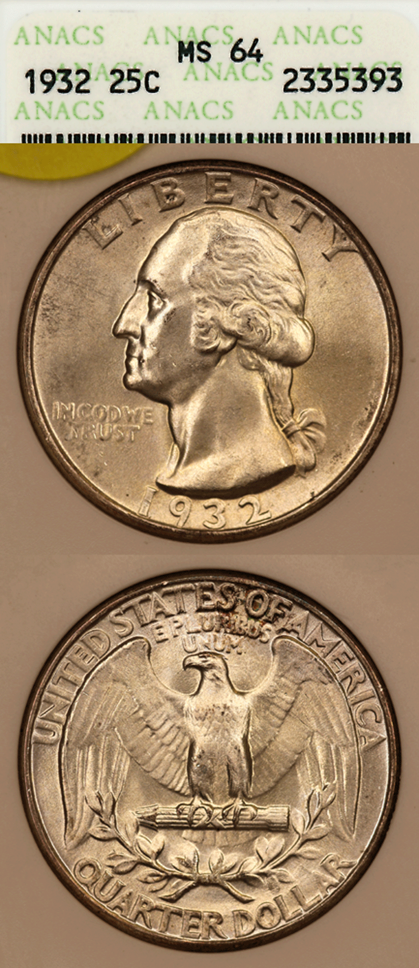 Item Number: WQ-312 ANACS Mint State 64 - Attractive First Year Type coin with near white lustrous surfaces and nice strike. In older small size ANACS holder.$110.00